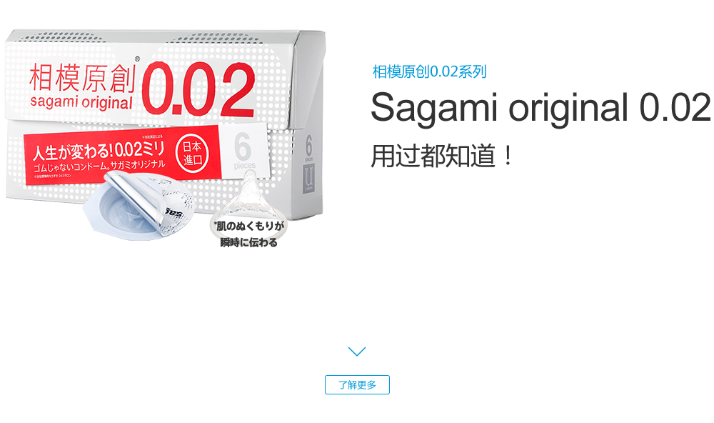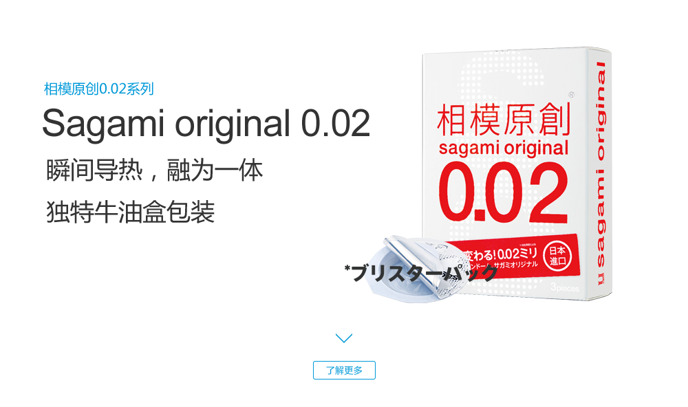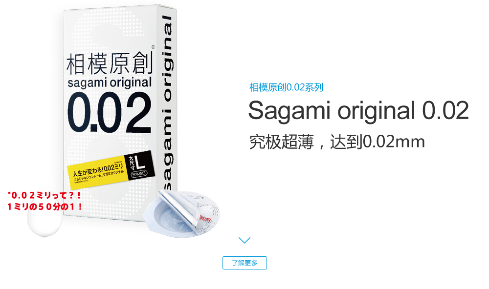 sagami original 0.02 (相模原創(chuàng)0.02系列), 是日本相模橡膠工業(yè)株式會(huì)社于1998年推出首次創(chuàng)新發(fā)明并向日本市場(chǎng)的一種以聚氨基甲酸酯 (高分子材料)為原料制成的非乳膠安全套, 厚度僅0.02mm, 是傳統(tǒng)的橡膠產(chǎn)品“厚度一半,強(qiáng)度三倍”, 并且擁有高導(dǎo)熱性能,讓產(chǎn)品使用體驗(yàn)更加美妙!